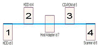 16. 다음 그림은 SCSI 장치 연결 구조이다. 터미네이터를 반드시 설정해야 하는 장치(번호)만을 열거한 것은?